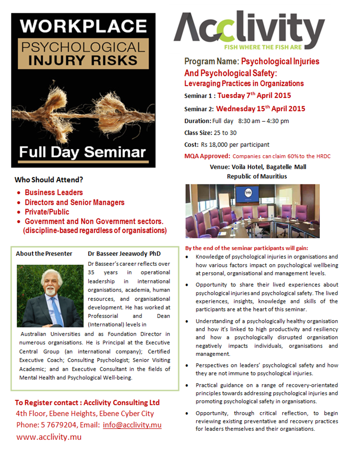 Workplace Psychological Injuries And Psychological Safety Seminar April 2015 Posted on 20 March 2015 by Faiz Hossenbocus in Blog Program Advert Acclivity Registration Booking form PSY Injuries Apr 15 Acclivity download program details PSY Apr 15 ver 190315 Seminar Psycological Injuries